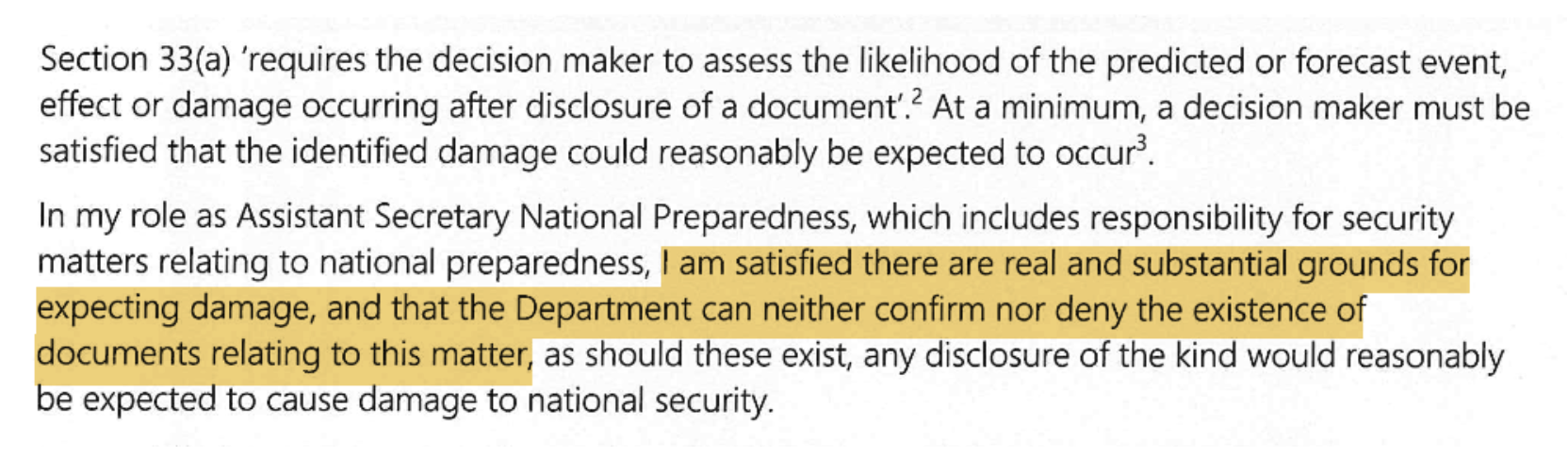 When MWM sought an internal review of the FOI decision, Janet Quigley, First Assistant Secretary of the Resilience and Crisis Management Division inside PM&C back the original neither confirm or deny decision.