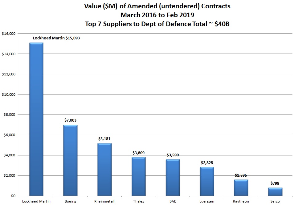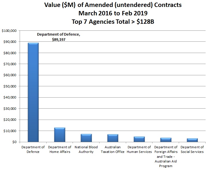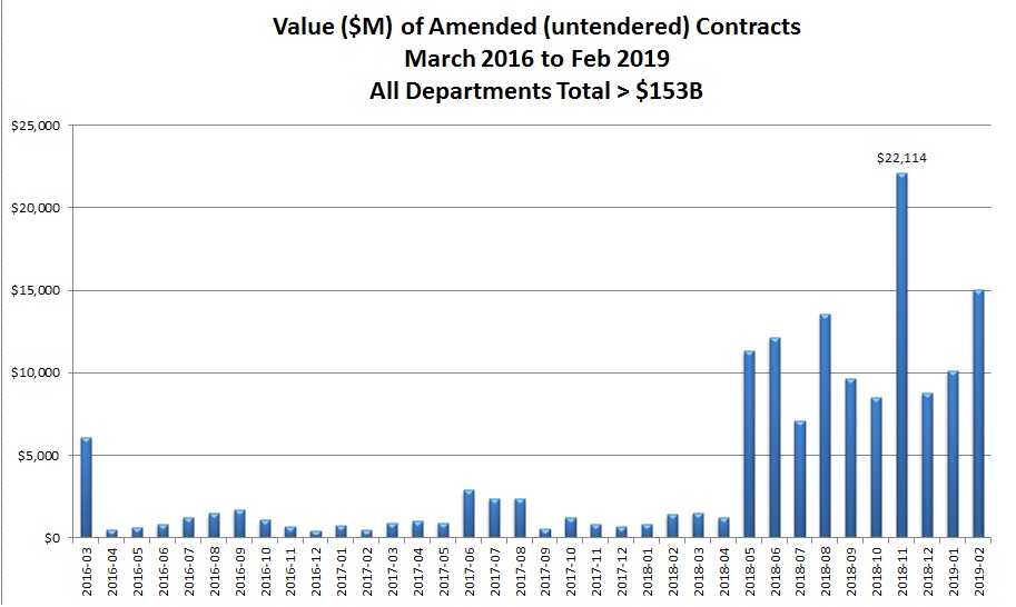There have been $153 billion in “amended contracts”, or untendered contracts struck by the government between March 2016 and February this year, the bulk of it in the past ten months, and the vast bulk of that in Defence spending.