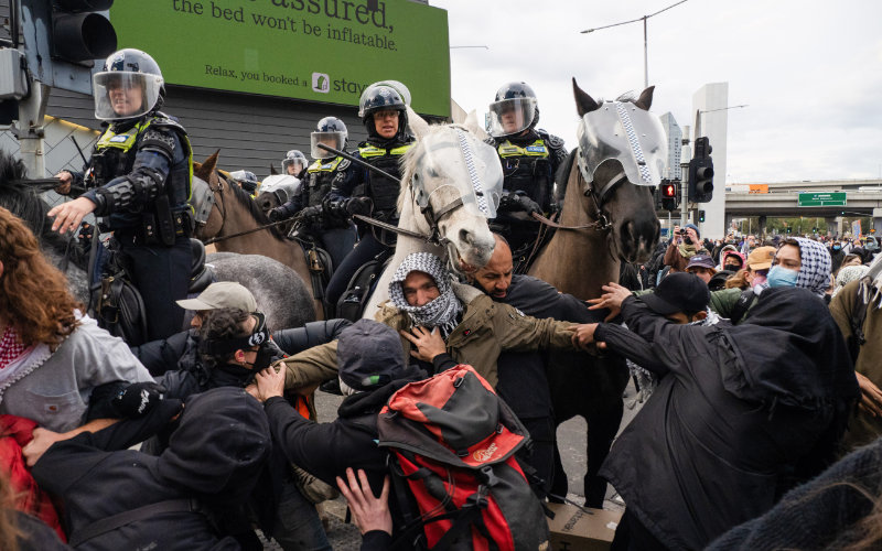 I was there to protest against the violence perpetrated around the world by some of the people inside the Melbourne Convention and Exhibition Centre, violence that is carried out using the weapons the delegates would be proudly displaying, buying and selling. By the end of the day, I saw and experienced a level of violence — almost entirely from the police — that I never imagined would occur in Melbourne.