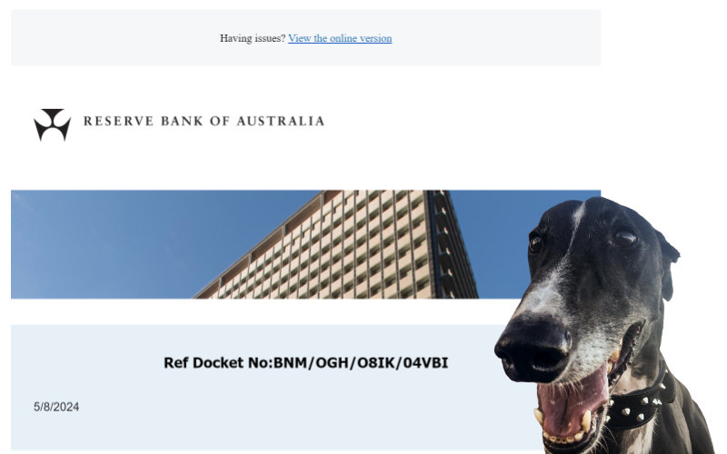 This was highly disrespectful from the RBA’s Communications Dept and may be the subject of a complaint to the e-Safety Commissioner for harassment via a carriage service. Although Johnnie does spend a great deal of time asleep on the couch at the MWM global headquarters, he is by no means dead.