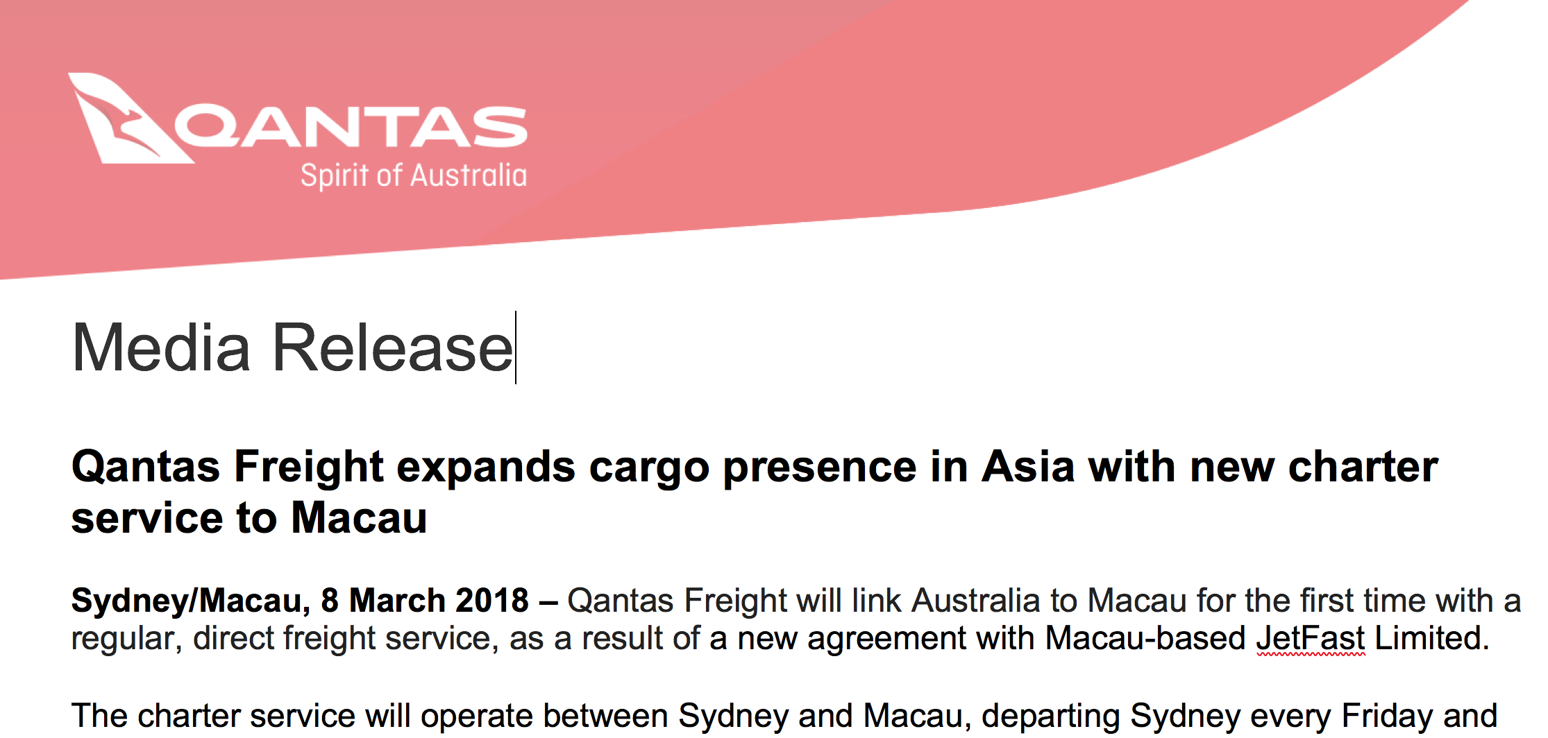 Under the contract, Qantas obtained a valuable a landing slot in Macau, a Special Administrative Region of the People’s Republic of China like Hong Kong, but a territory which Qantas has never previously flown into with either its freight or passenger jets.