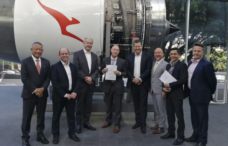 Qantas and JetFast Macau executives at Sydney Airport following signing of their contract. Pictured Left to Right: Harold Pang (Qantas Freight Head of Asia Sales), Riki Cannon (Qantas Freight Head of Network and Margin) Nick McGlynn (Qantas Freight COO), Reuben Milne (JetFast CEO and founder), Paul Jones (Qantas Freight EGM), Peter Cheng (JetFast Director), Richard Hoogwerf (Qantas Head of customer strategy), Peter Collyns (Qantas Freight Head of Global Sales)