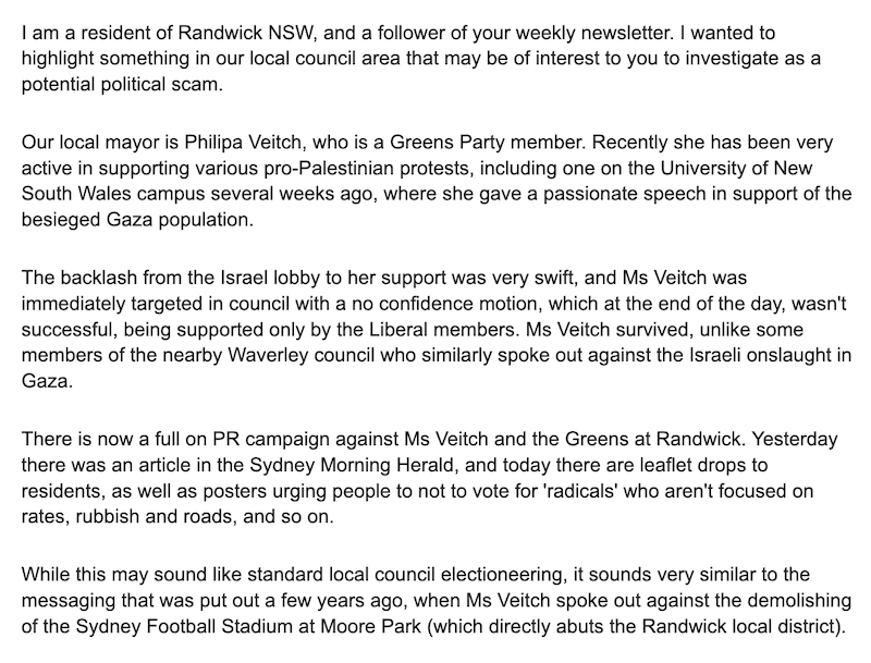 MWM sources attest that the ructions at Inner West Council are mirrored elsewhere in local government. This from Randwick in Sydney’s East.