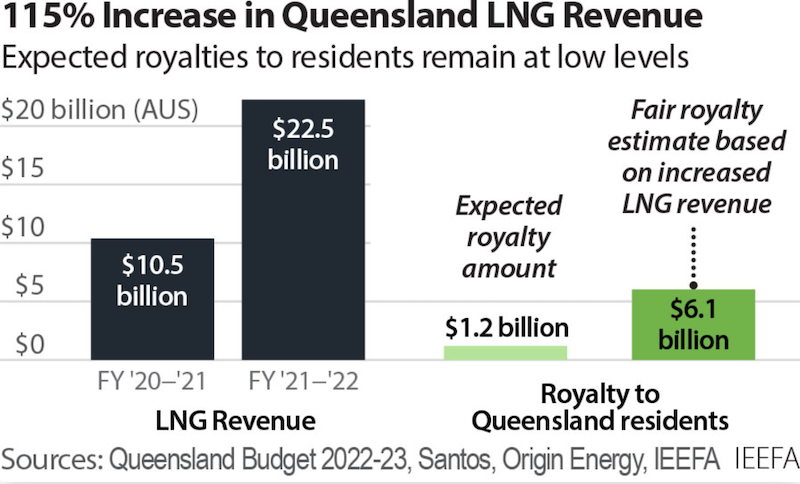 The scam is Australia’s insipid governments and regulators are being gamed by the gas lobby, exploited like never before. Thanks to oil and gas industry spin, and thanks to a meek and compromised finance press, foreign multinationals are pillaging our resources like never before. The latest report from energy analysts at IEEFA estimates the gas majors’ revenue has surged 115% but the royalties they pay to Australian governments, which is already very low, are not rising in step with income and profits.