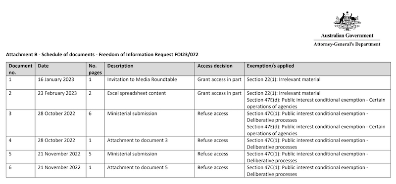 The response to a Freedom of Information request filed by former Senator Rex Patrick on January 23 found that the contacts for the Roundtable were Elizabeth Brayshaw, Assistant Secretary, National Security Information Branch, and two others whose names had been redacted from the FOI: a “Senior Adviser, Office of the Attorney-General” and a “Director, Information Protection Section”.