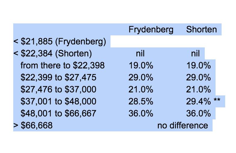 • Shorten’s counter-offers: an extra $95 up to $37,000: so that LAMITO gives a $150 flat up to $37,000; then he copies Frydenberg.