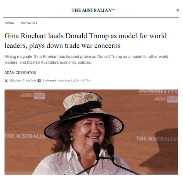 That third who would vote for Trump if they could pretty much match the One Hanson supporters who are aware an election is being held plus the conservative end of the increasingly conservatively-ended LNP – the end that hangs on every word of its biggest benefactor, Gina Rinehart, and can’t resist aping every Republican Party move.