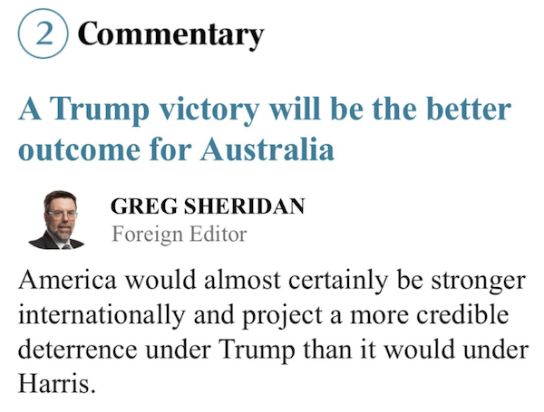 Given the saturation coverage here of the election and, especially, Trump’s multitudinous legal, character and policy failings, not to mention his level of dingbat craziness that only Greg Sheridan could like, that is a bit of a worry about the direction of our own nation’s psyche.
