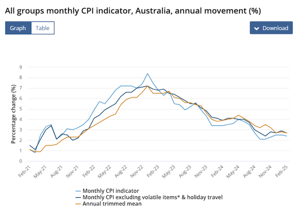 The consumer price index – the thing the RBA is mandated to manage  – landed at 2.4 per cent over the year to February. It’s been under or on the RBA review’s new preference of a 2.5 per cent target since September.