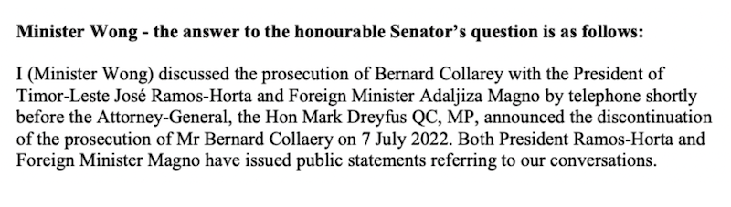 We then turn to the answer just provided to the Senate about dialogue between the Australian and Timor-Leste government on the topic of Collaery. Wong provided the following: