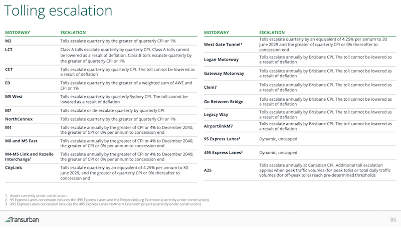 If you check out the chart below, buried deeply in the appendix to an ASX investor presentation, you will find your nearest friendly toll road and its “escalation” clause – that is, the deal Transurban struck with particular state governments.