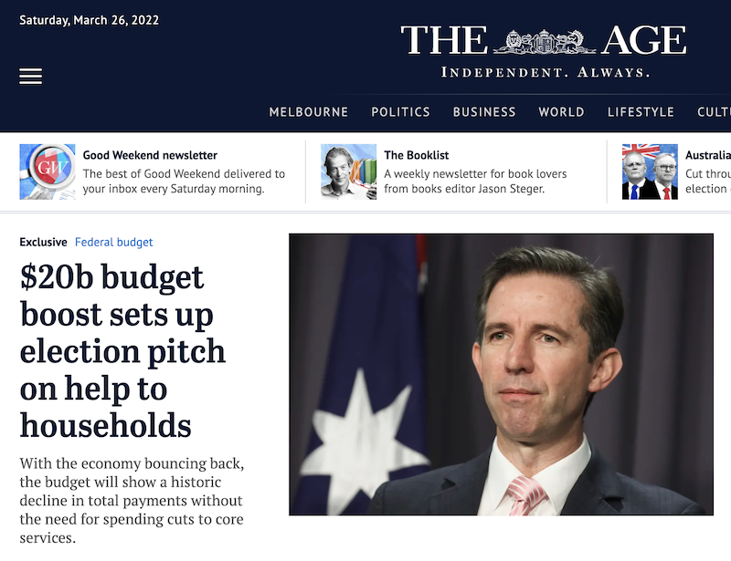 Nine’s Age and SMH splash for their Budget curtain-raisers this weekend trumpeted a “$20bn Budget boost”, a “bouncing economy”, and a “historic decline in payments”. They truly do believe in miracles at Nine because the reality is historic debt and deficit and a rampant surge in the cost of living.