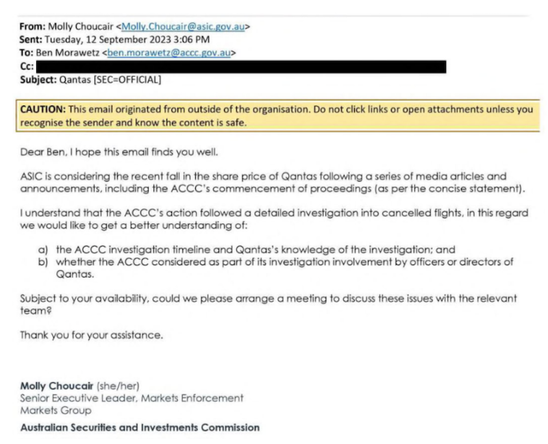 On September 12, 2023, ASIC did ask to speak to the ACCC about the Qantas action being taken in the Federal Court and whether the ACCC had looked into the involvement of Qantas officials and executives.