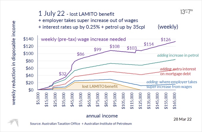 It was missed by the media in the Coalition’s March Budget but most Australian workers are probably $50 a week worse off from July as the LAMITO tax offset was removed. That’s Low And Middle Income Tax Offset. Add to that the cost of living pressures from the removal of the temporary cut to petrol excise which cuts in this week. Then there’s the big one: rising interest rates.