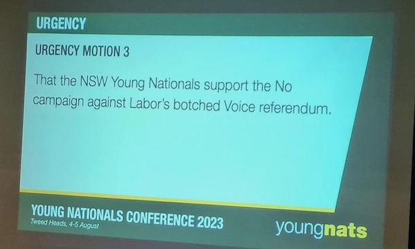 - “That the NSW Young Nationals support the yes campaign of the Voice to Parliament Referendum”